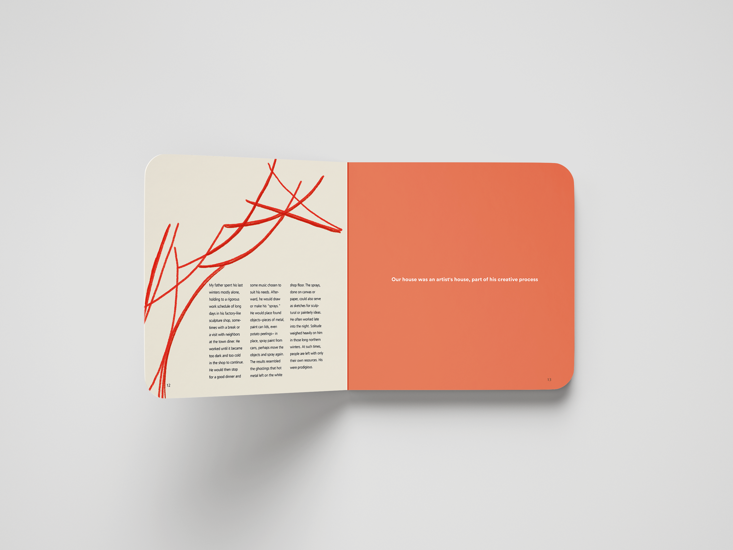 To enhance engagement in a text-heavy book and make it playful and interactive, the book is design as a children’s book. The book incorporates vibrant doodles derived from the sculptures created by Smith. The title, derived from a part of Smith's sculpture, creatively transforms an element of his work into a visually captivating letter. The book features four dynamic popup strategically placed to enliven the content.