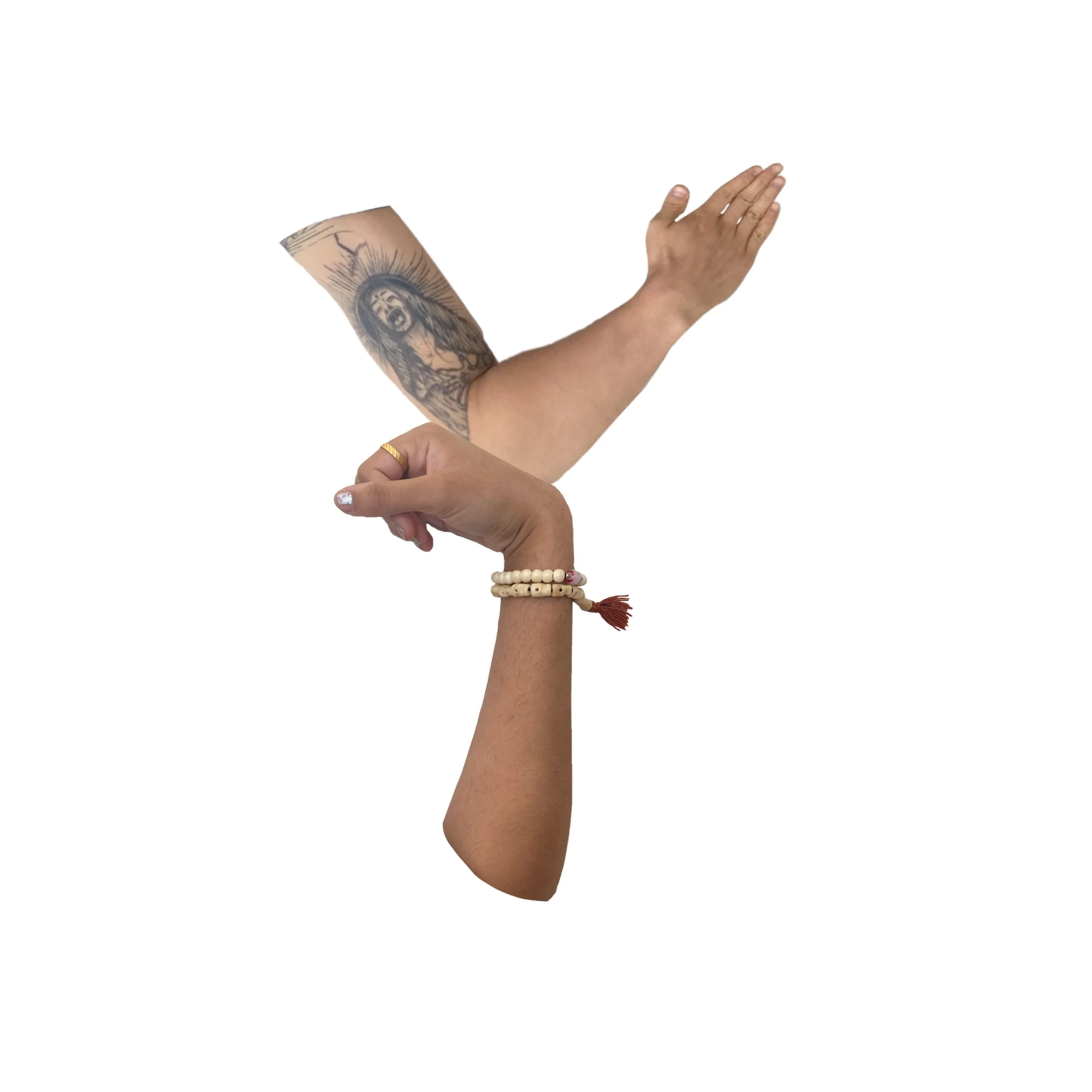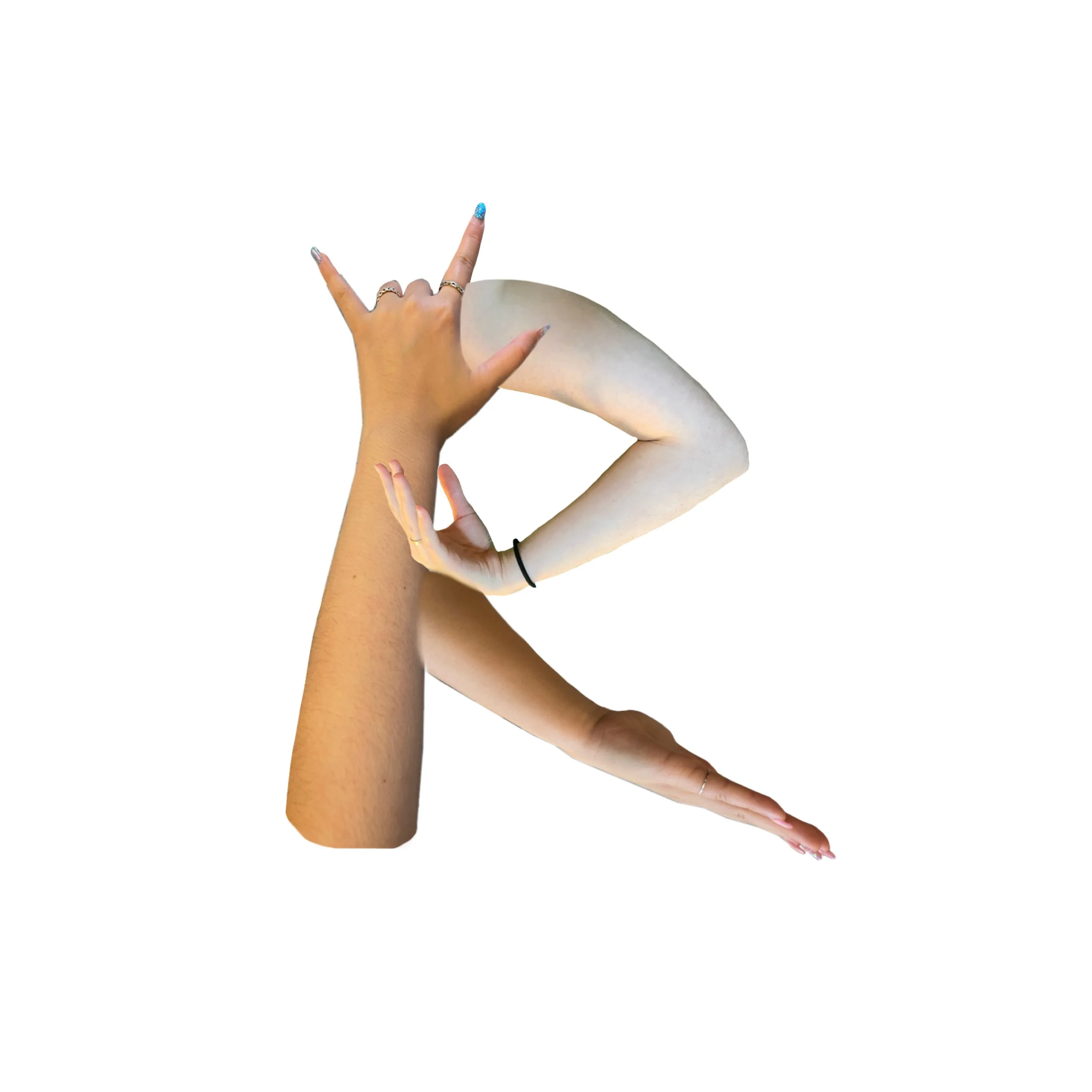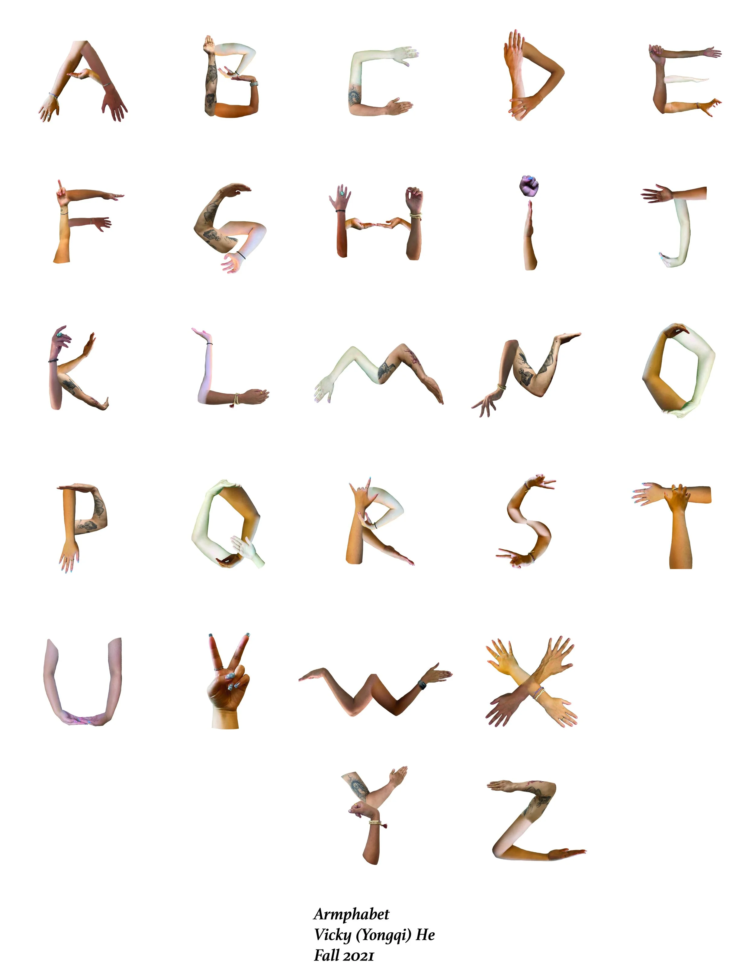 Each letter was collaged by arms and hands from different people. This alphabet series shows diversity and inimitable through patterns, decorations, and colors on the arms and hands.